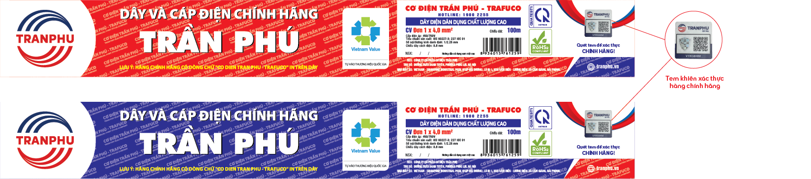 Với hệ thống tem nhãn công nghệ mới, Cơ điện Trần Phú – TRAFUCO tin rằng sẽ tạo thêm “lá chắn” vững chắc bảo vệ uy tín thương hiệu cho các nhà phân phối, đồng thời mang đến sự an tâm tuyệt đối cho người tiêu dùng khi lựa chọn sản phẩm dây cáp điện Trần Phú chính hãng.