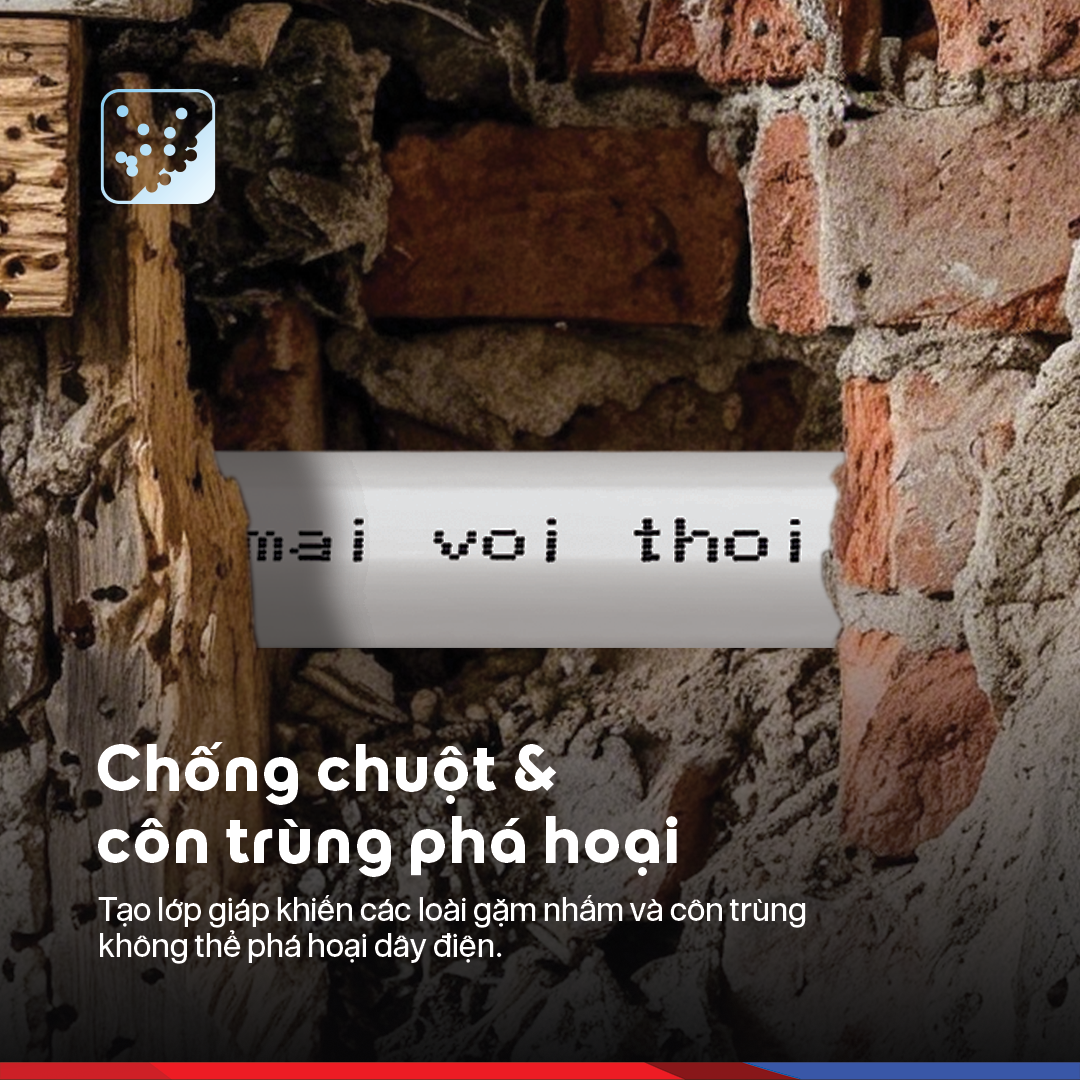Vật liệu cấu tạo ống được bổ sung các thành phần giúp hạn chế sự xâm nhập và phá hoại của côn trùng, mối mọt. Nhờ lớp bảo vệ này, dây điện không còn bị tác động trực tiếp bởi các yếu tố sinh học - một nguyên nhân phổ biến gây hỏng lớp vỏ nhưng thường bị bỏ qua trong thi công.
