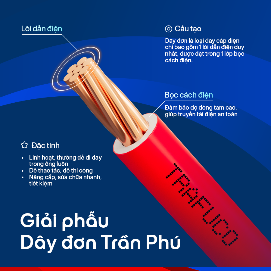 Trong hệ thống điện dân dụng và công nghiệp, dây điện đơn đóng vai trò nền tảng, quyết định trực tiếp đến độ an toàn và ổn định của toàn bộ công trình. Dây điện đơn Trần Phú – TRAFUCO được sản xuất từ đồng tinh khiết kết hợp lớp vỏ cách điện đạt chuẩn, đáp ứng tốt các yêu cầu kỹ thuật khắt khe trong thi công thực tế. Bài viết dưới đây sẽ giúp bạn hiểu rõ đặc tính kỹ thuật, cách phân loại và những lưu ý quan trọng khi ứng dụng dây điện đơn Trần Phú – TRAFUCO vào từng hạng mục công trình.