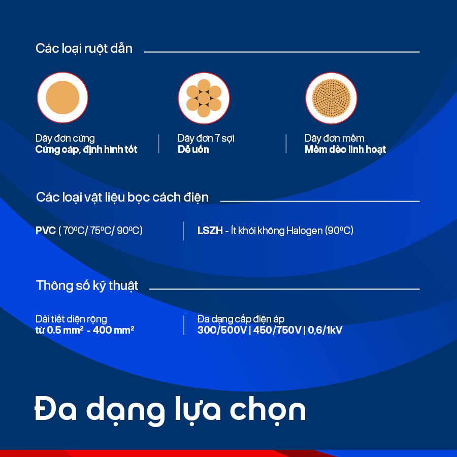 • Dải tiết diện đa dạng từ 0,5 mm² đến 400 mm², đáp ứng linh hoạt các yêu cầu từ hệ thống điện dân dụng đến công trình công nghiệp.