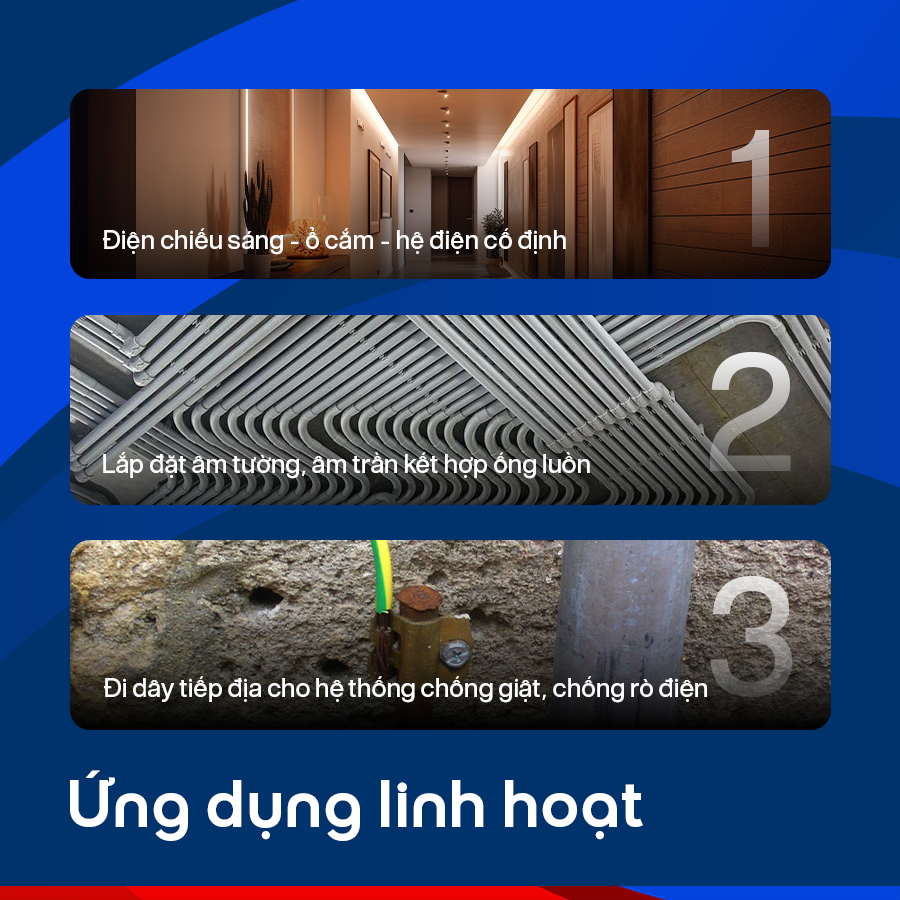 • Đa dạng lựa chọn về khả năng chịu nhiệt (70°C, 75°C, 90°C) và cấp điện áp (300/500V; 450/750V; 0,6/1kV), phù hợp với nhiều điều kiện lắp đặt và tiêu chuẩn kỹ thuật khác nhau.